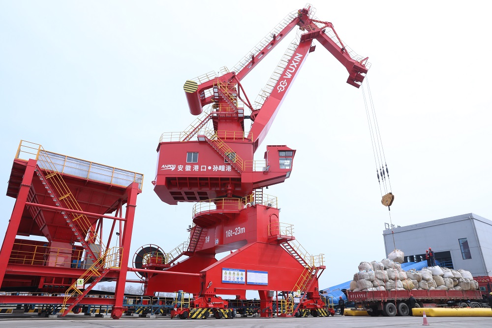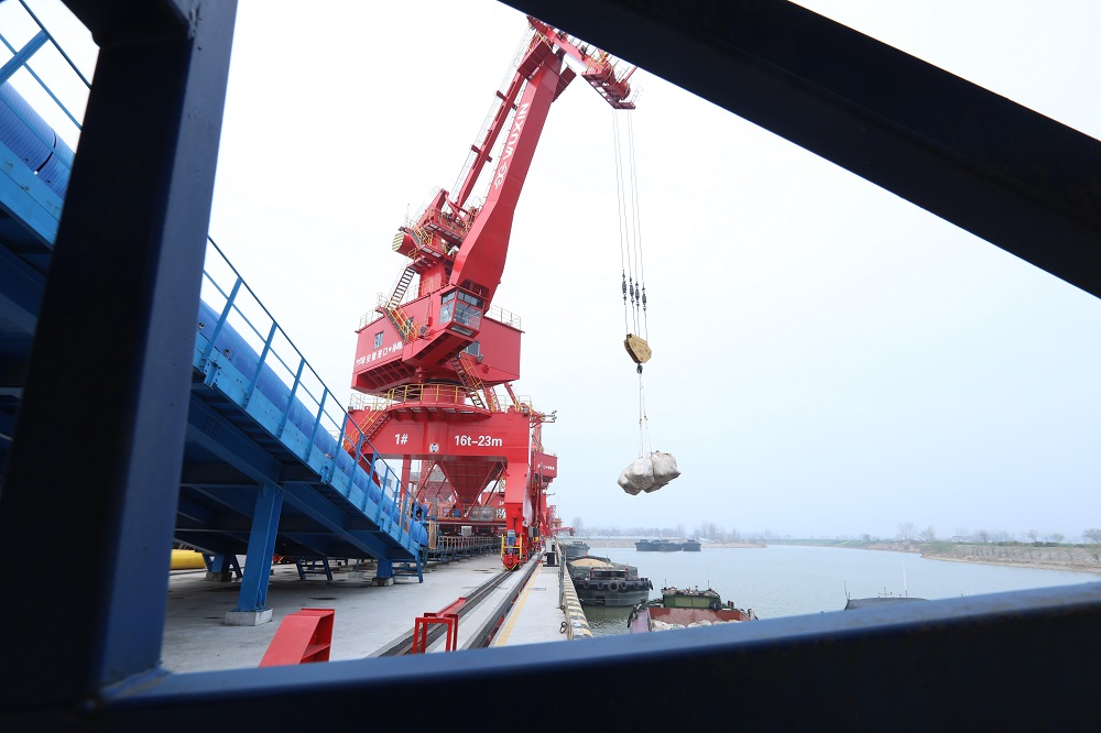 3月26日,記者來到淮北市濉溪縣孫疃港,現(xiàn)場起重機(jī)、多用途門機(jī)、移動式裝船機(jī)屹立在澮河岸邊正在吊運(yùn)貨物,一派忙碌的景象。