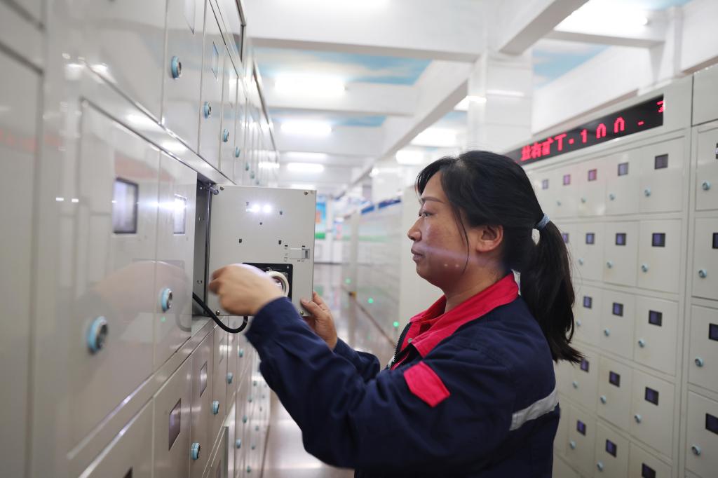 圖為該礦保運區(qū)燈房女工王方正在檢查礦燈充電情況。
