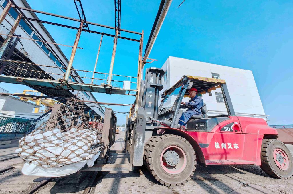 圖為運輸區(qū)叉車司機張振正在叉運物料