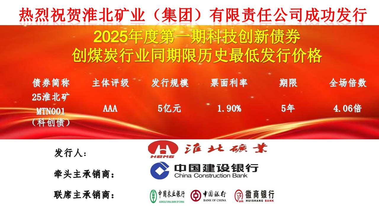 2025年7月8日,淮北礦業(yè)集團(tuán)在銀行間市場(chǎng)成功發(fā)行2025年第一期科技創(chuàng)新債券——25淮北礦MTN001(科創(chuàng)債),發(fā)行規(guī)模5億元,期限5年,票面利率1.90%,全場(chǎng)認(rèn)購(gòu)倍數(shù)4.06倍,創(chuàng)煤炭行業(yè)同期限債券價(jià)格最低、集團(tuán)債券票面利率新低,充分顯示資本市場(chǎng)對(duì)淮北礦業(yè)集團(tuán)科技創(chuàng)新實(shí)力和高質(zhì)量發(fā)展前景的堅(jiān)定信心。