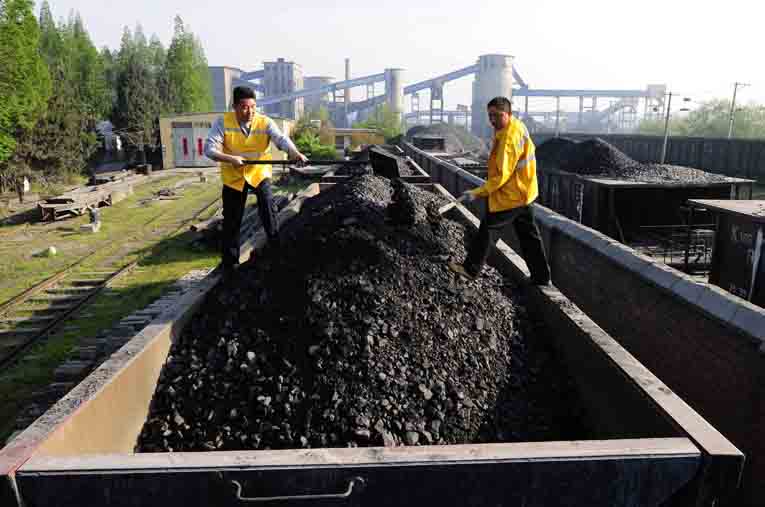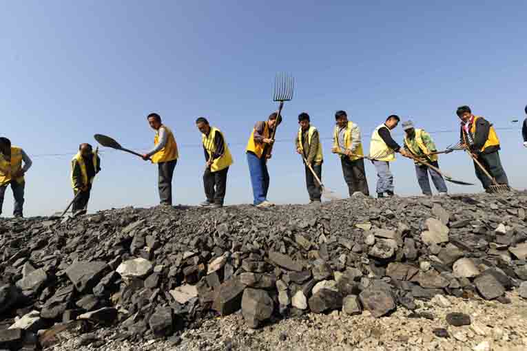 工人在兩面環(huán)水的路基上充填矸石