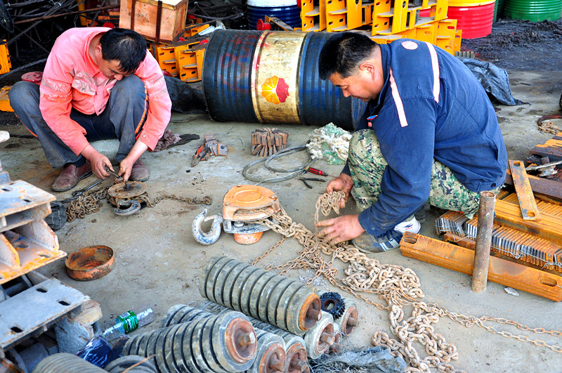 圖為煤三項目部機(jī)電隊職工正在對損壞的滑子進(jìn)行修復(fù)。
