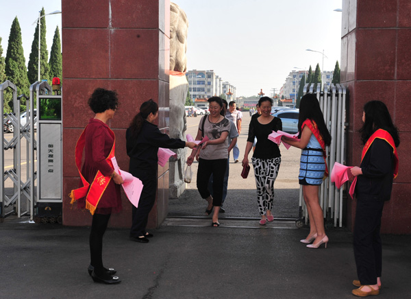 圖為:6月5日上午,4名“環(huán)保使者”正在公司門(mén)口發(fā)放“六五”世界環(huán)境日宣傳單。