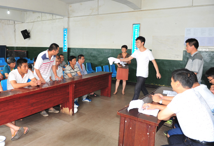圖為:8月25日中午,公司東部井職教辦負(fù)責(zé)人正在運(yùn)輸區(qū)會議室隨機(jī)抽考出勤職工的安全知識,答對者可以獲得一份小獎(jiǎng)品。