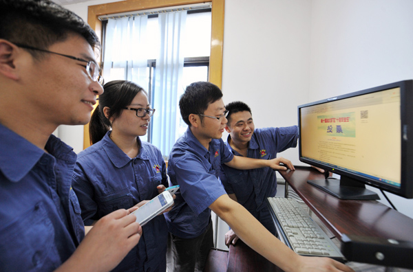日前,淮北礦業(yè)第十屆淮北礦區(qū)“十佳畢業(yè)生”評選活動全面啟動?;幢边x煤廠青年職工熱情參與此次評選活動,學習優(yōu)秀畢業(yè)生敬業(yè)奉獻、刻苦鉆研、勇于拼搏的高尚品質(zhì)。圖為:9月6日,該廠青工在電腦前閱讀候選人事跡,并通過手機微信平臺投票選舉心中的榜樣。