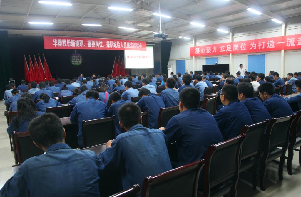 9月9日晚,華塑公司召開百人廉潔談話會,教育和提醒新提職、重要崗位、兼職紀檢網(wǎng)員嚴格遵守集團公司、公司廉潔從業(yè)有關(guān)規(guī)定,高舉“維護公司利益人人有責(zé)”的大旗,營造風(fēng)清氣正、干事創(chuàng)業(yè)的良好氛圍。