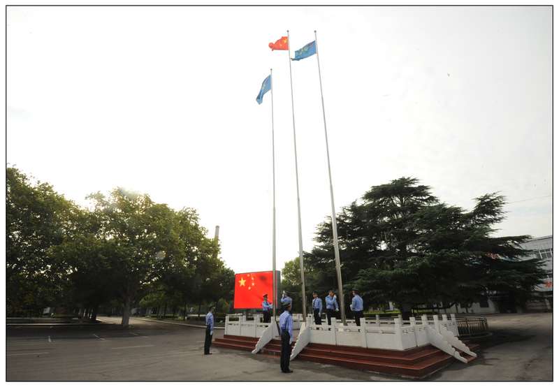 10月1日國慶節(jié),7點(diǎn)50分,伴著朝霞,朱莊礦由7名武保隊員組成的護(hù)旗隊,在大家地注視下,英姿勃發(fā)的昂首闊步前行,精神抖擻地護(hù)衛(wèi)著中華人民共和國國旗和淮北礦業(yè)旗走向位于工業(yè)廣場中心的升旗臺。