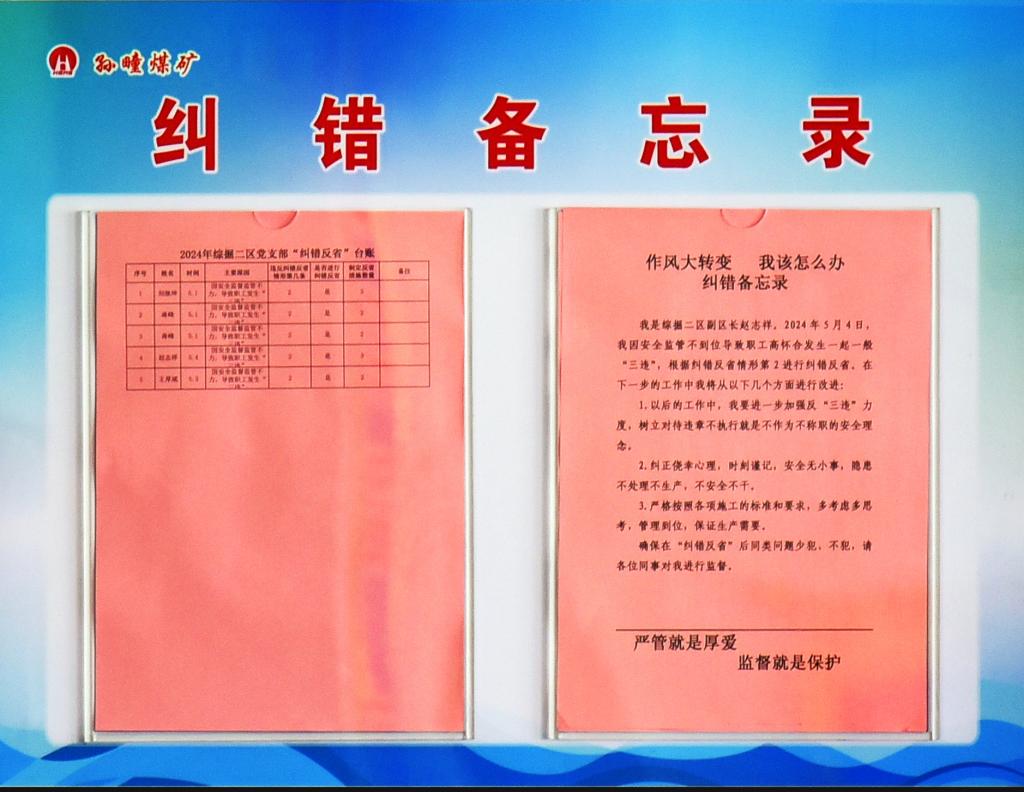 “每月,召開推進(jìn)會,總結(jié)分析‘糾錯反省’情形,建立備忘錄時刻提醒自己反躬自省,別人犯過的錯,自己不能重蹈覆轍;上級反復(fù)強(qiáng)調(diào)、三令五申的工作,必須保質(zhì)保量完成;跌倒過一次的地方,要爬起來,堅(jiān)決不能摔倒第二次?!本C掘二區(qū)區(qū)長蔣昊良說。