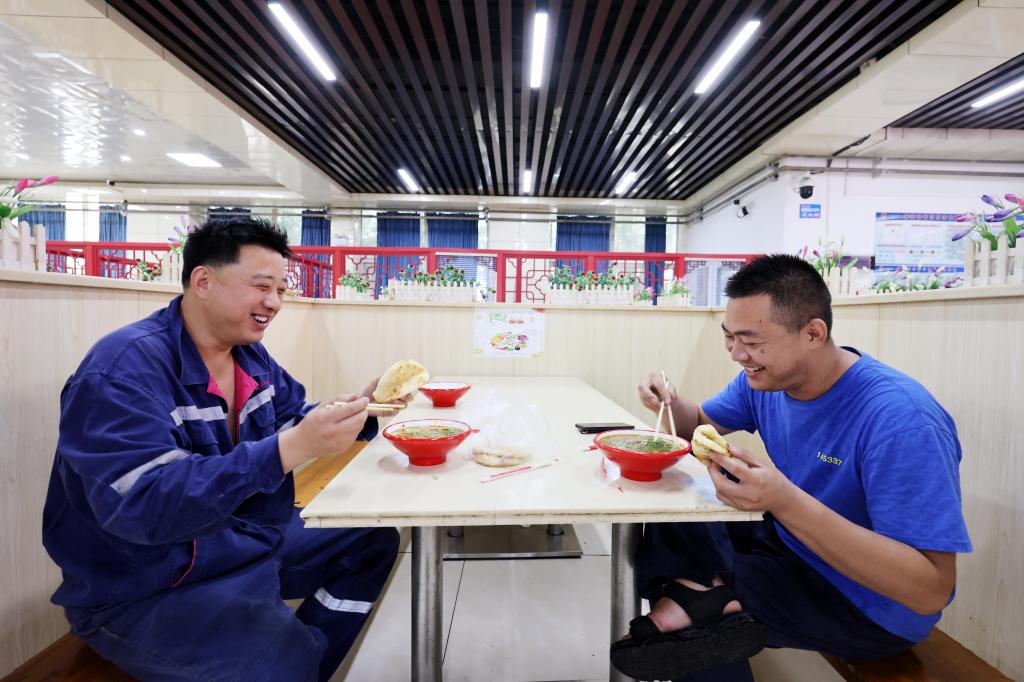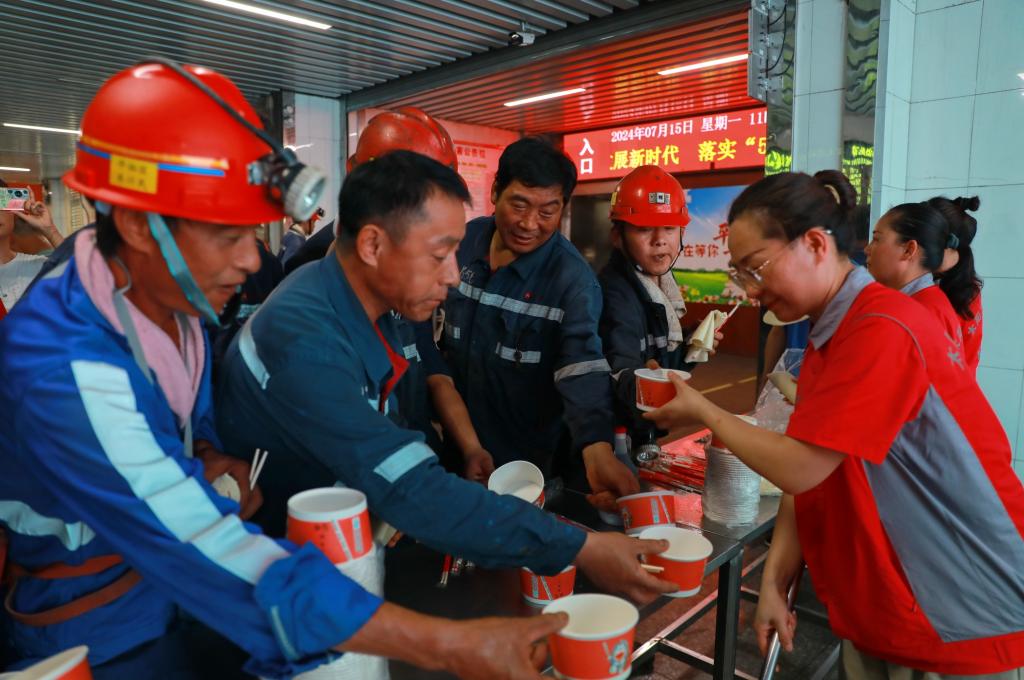 7月15日,童亭礦兩名剛下班的職工喝著免費(fèi)的羊湯,不禁發(fā)出幸福的感慨。