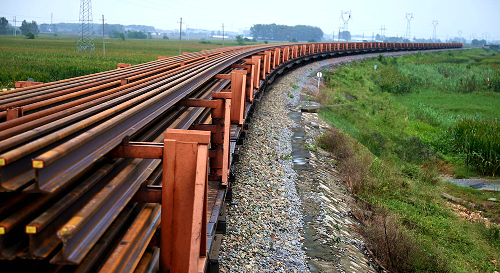 此次運(yùn)輸?shù)拈L軌為淮宿蚌城際鐵路建設(shè)所需,均為焊接而成的500米長軌,分為上下4層儲(chǔ)運(yùn)。首列長軌列車是國鐵先通過京滬線將長軌運(yùn)輸至蘆嶺交接口,然后換鐵運(yùn)處機(jī)車從前邱車站運(yùn)至淮宿蚌城際鐵路鋪軌基地。