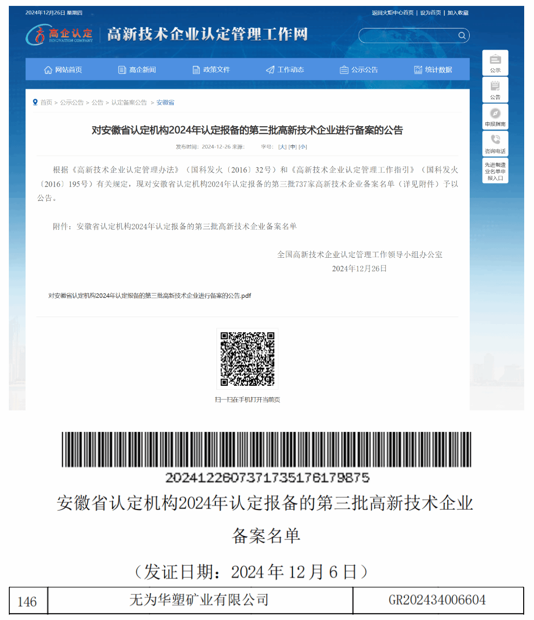 日前,全國(guó)高新技術(shù)企業(yè)認(rèn)定管理工作領(lǐng)導(dǎo)小組辦公室公布安徽省認(rèn)定機(jī)構(gòu)2024年認(rèn)定報(bào)備的第三批1024家高新技術(shù)企業(yè)名單,華塑股份無為華塑礦業(yè)有限公司榜上有名。這是無為華塑自2018年以來第三次獲得國(guó)家“高新技術(shù)企業(yè)”稱號(hào)。