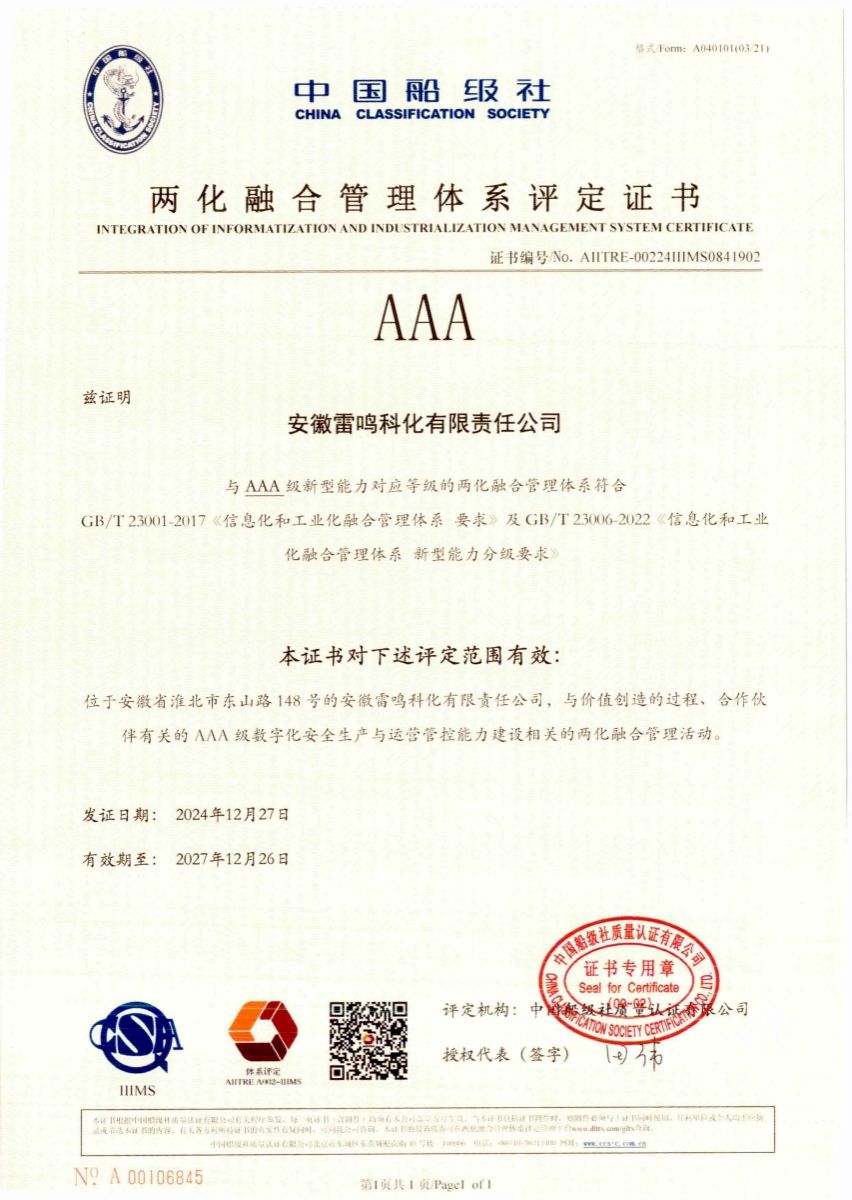 近日,雷鳴科化公司通過國家信息化和工業(yè)化融合(以下簡稱兩化融合)管理體系評定,獲得兩化融合管理體系最高等級AAA級評定證書。