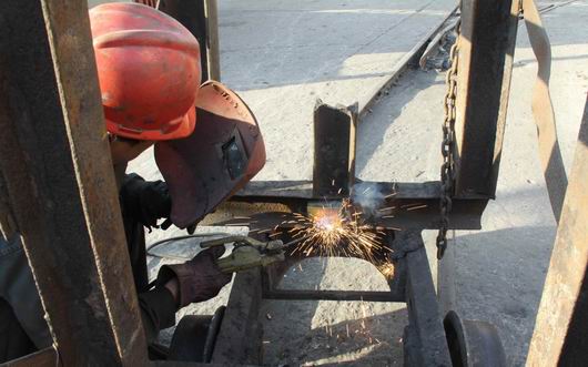 圖為桃園礦運(yùn)輸區(qū)機(jī)電工焊接井下礦車(chē)定位卡