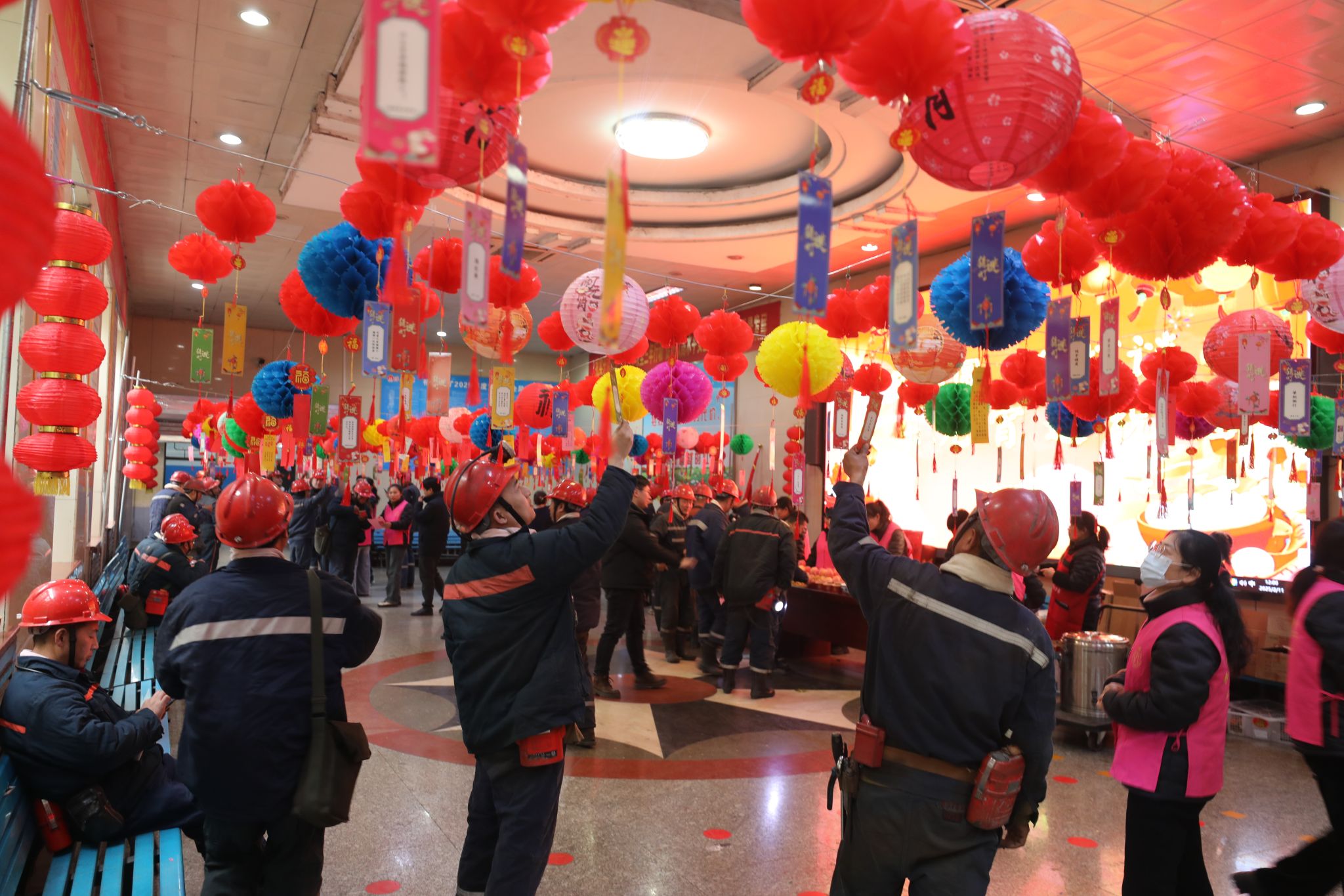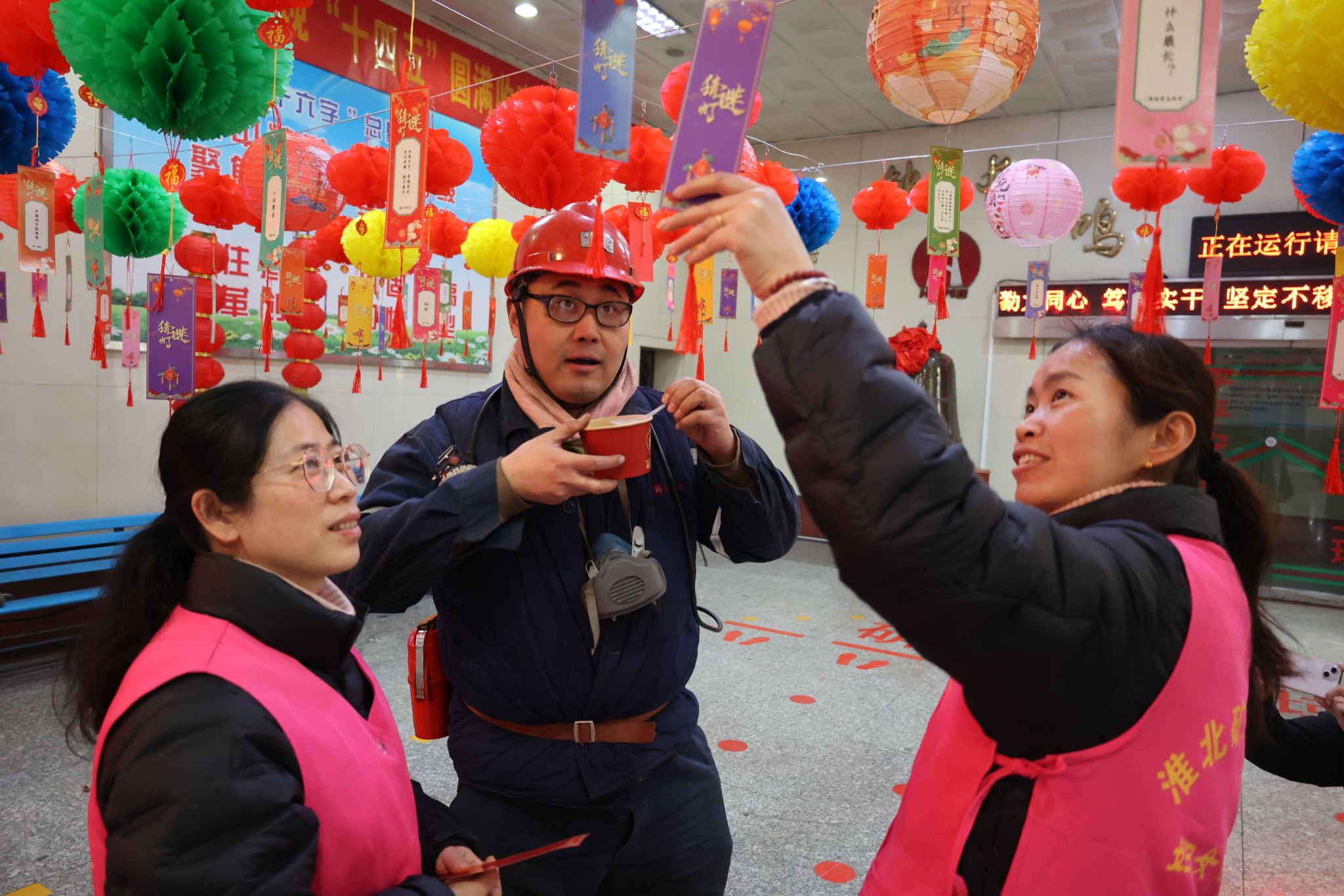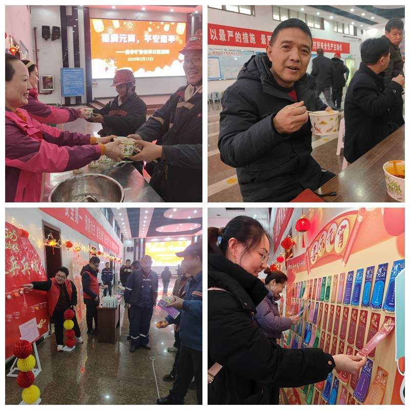 “師傅,元宵節(jié)快樂(lè)!這碗芝麻餡湯圓趁熱吃!”“猜中燈謎就能領(lǐng)洗發(fā)水啦!” 2月11日中午,朱仙莊礦職工食堂傳來(lái)一陣陣歡聲笑語(yǔ),志愿者們忙碌的身影在紅燈籠下穿梭,為前來(lái)就餐的職工送上了節(jié)日的溫暖。