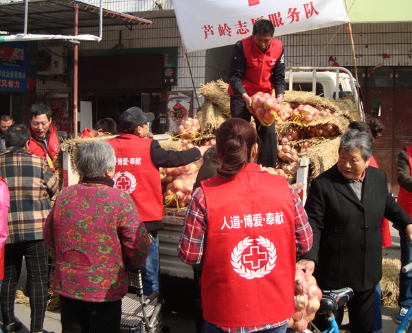 “阿姨,您嘗嘗,這是碭山的蘋果。”“大爺,我?guī)湍烟O果提回家?!?3月20日上午,30多名蘆嶺礦志愿者們正忙著幫助碭山高度殘疾果農(nóng)李娟銷售滯銷的蘋果。