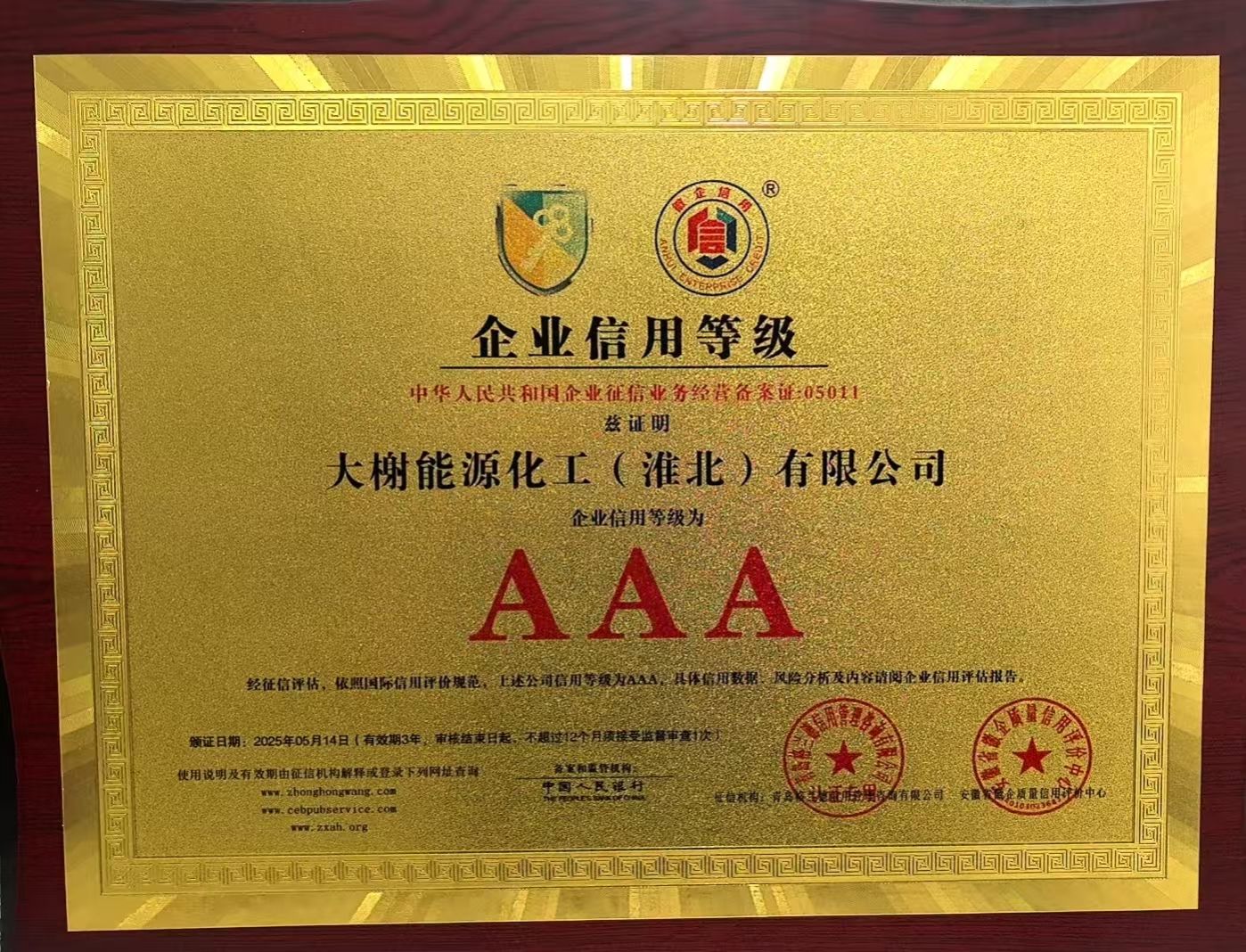 近日,大榭能源化工(淮北)有限公司憑借良好的合同履約能力、完善的信用管理體系和良好的市場(chǎng)信譽(yù),成功獲評(píng)安徽省AAA級(jí)企業(yè)信用等級(jí)認(rèn)證。這不僅是對(duì)公司綜合實(shí)力、經(jīng)營(yíng)管理水平和誠(chéng)信經(jīng)營(yíng)理念的高度認(rèn)可,更為公司在激烈的市場(chǎng)競(jìng)爭(zhēng)中贏得了一張含金量十足的“信用金名片”。