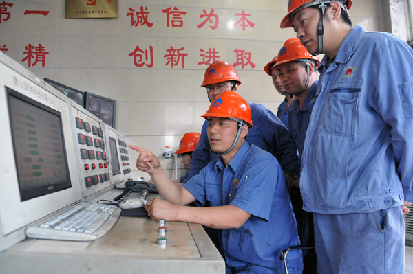 5月23日,淮北選煤廠選煤車間黨員干部楊永鋒(中)正在重介控制室內(nèi)向職工分析降低介耗、提升精煤產(chǎn)率的要點(diǎn)。該廠在開展“兩學(xué)一做”學(xué)習(xí)教育中,把“示范引領(lǐng)”作為重點(diǎn),實(shí)施“干部擔(dān)當(dāng)”工程,黨員干部立足選煤實(shí)際,帶頭開展技術(shù)創(chuàng)新與小改小革,用智慧破解難題,用行動作出表率,彰顯了黨員本色。