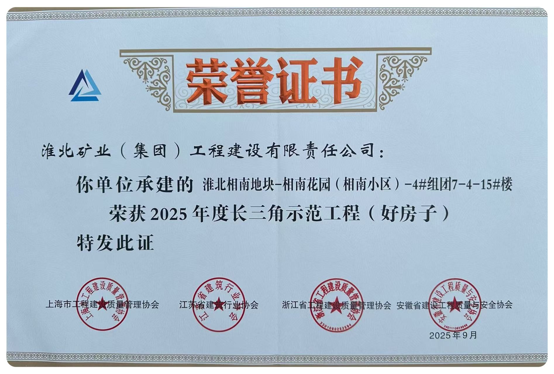 近日,由工程建設(shè)公司承建的淮北相南地塊-相南花園(相南小區(qū))-4#組團(tuán)7-4-15#樓項(xiàng)目榮獲2025年度“長(zhǎng)三角示范工程(好房子)”稱(chēng)號(hào),成為安徽省唯一獲評(píng)該項(xiàng)稱(chēng)號(hào)的住宅項(xiàng)目,并作為安徽省好房子建設(shè)代表作經(jīng)驗(yàn)交流發(fā)言。