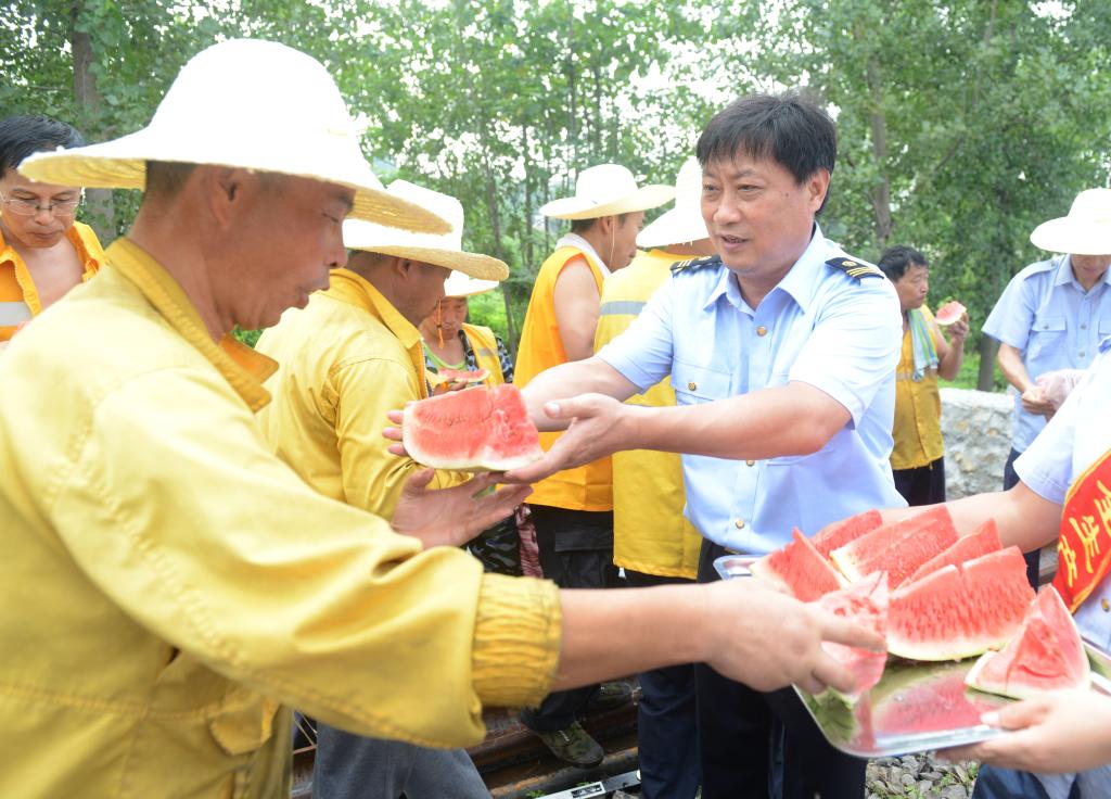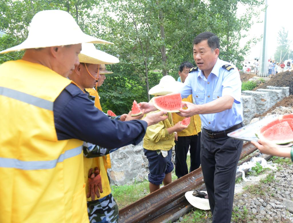 炎炎夏日,驕陽(yáng)似火。7月29日,鐵運(yùn)處領(lǐng)導(dǎo)班子一行到烈山洪莊道口施工現(xiàn)場(chǎng)慰問(wèn)高溫作業(yè)下的一線職工,為他們送去純凈水、西瓜、毛巾、香皂、風(fēng)油精等防暑降溫慰問(wèn)品,把清涼和領(lǐng)導(dǎo)的關(guān)懷送到一線職工心坎上。
