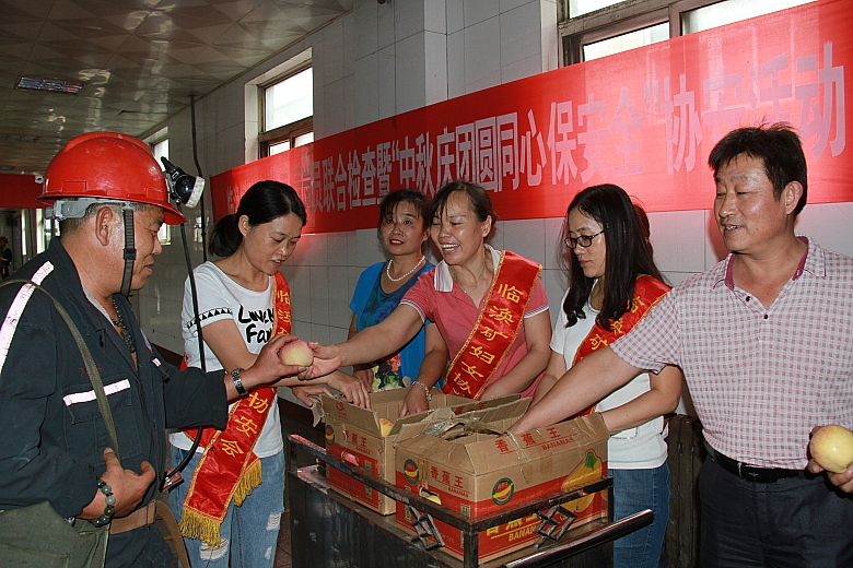 9月15日,中秋節(jié)當(dāng)天中午,在副井口開(kāi)展了“職工代表、青崗員聯(lián)合檢查暨‘中秋慶團(tuán)圓,同心保安全’協(xié)安活動(dòng)。10多名職工代表、青崗員分成三個(gè)組,分別深入到1034 機(jī)巷、1061外風(fēng)巷、9111工作面等地點(diǎn)進(jìn)行了實(shí)地安全生產(chǎn)大檢查,排查安全隱患,督促干部職工按章作業(yè),確保礦井節(jié)日期間安全生產(chǎn)。黨群工作部(工會(huì))專(zhuān)門(mén)購(gòu)買(mǎi)了蘋(píng)果,婦女協(xié)安員們放棄休班時(shí)間,提前運(yùn)送到副井口,在中班上下井交窯時(shí)間,親手把寓意著平安、幸福的蘋(píng)果發(fā)放到干部職工手中,送上節(jié)日的祝福,叮囑他們下井一定要遵章守紀(jì),搞好安全生產(chǎn)。