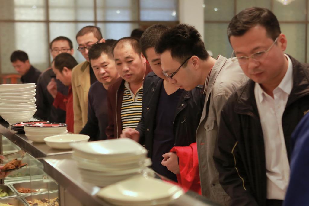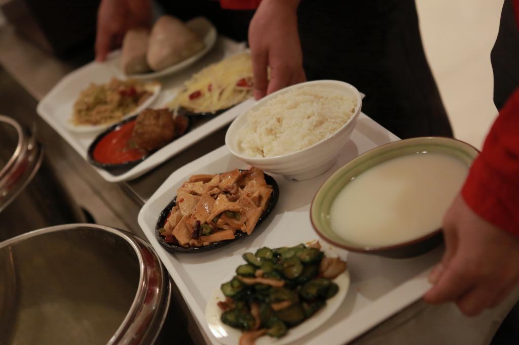 10月10日中午,渦北礦職工餐廳二樓自選廳內(nèi)人頭攢動(dòng),就餐人員盡然有序地排隊(duì)挑選心儀的飯菜。