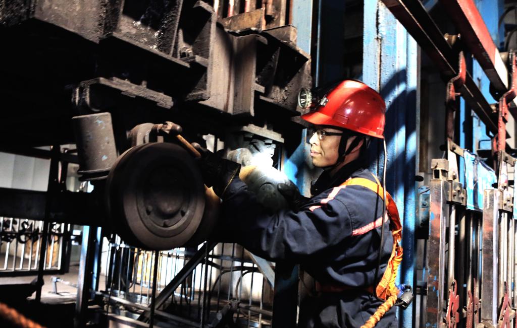 圖為:12月5日,機(jī)電科一名職工在新副井口進(jìn)行設(shè)備維護(hù)和隱患排查。