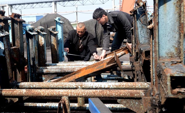 礦兩名職工用尺子在廢料堆里“尋寶”。