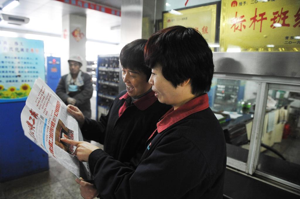淮北礦業(yè)“兩會”召開后,青東煤業(yè)組織干部職工通過電視、網(wǎng)站、報紙等形式,第一時間學(xué)習(xí)會議精神,明確2017年工作目標(biāo)任務(wù),讓廣大職工對企業(yè)未來的發(fā)展充滿期待和憧憬,干群士氣空前高漲。圖為該公司機電科燈房班女工通過《淮北礦工報》關(guān)注“兩會”召開盛況。