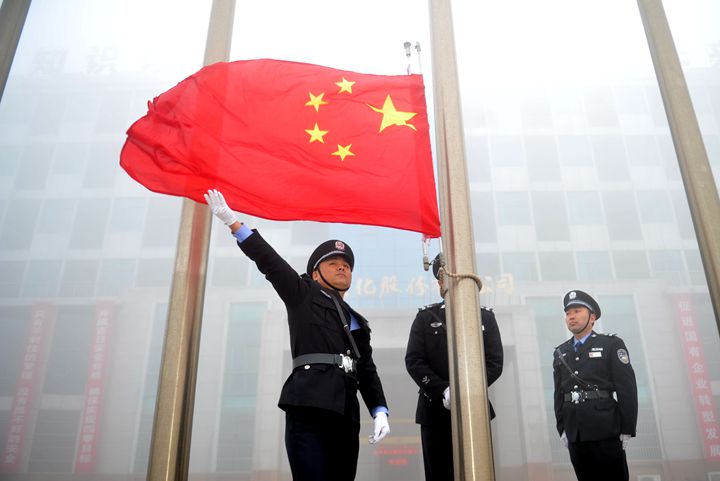 早上8點15分,武保部三名旗手邁著整齊的步伐將國旗護送至升旗臺。鮮艷的五星紅旗在雄壯的國歌聲中,緩緩上升?,F(xiàn)場人員行注目禮,表情莊重、肅敬。