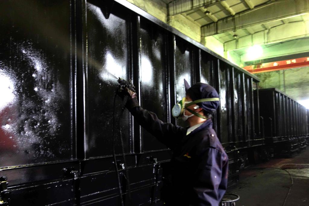 為確保歲末年初煤炭運(yùn)輸安全、高效,鐵運(yùn)處以“百日安全會(huì)戰(zhàn)”活動(dòng)為契機(jī),精心組織檢修人員,強(qiáng)化對(duì)處內(nèi)庫(kù)停機(jī)車(chē)和扣修車(chē)輛的維修保養(yǎng),全面排除故障隱患,確保年底機(jī)車(chē)、車(chē)輛運(yùn)用安全。圖為:該處一名青年檢修人員正在對(duì)修復(fù)車(chē)輛進(jìn)行噴漆作業(yè)。