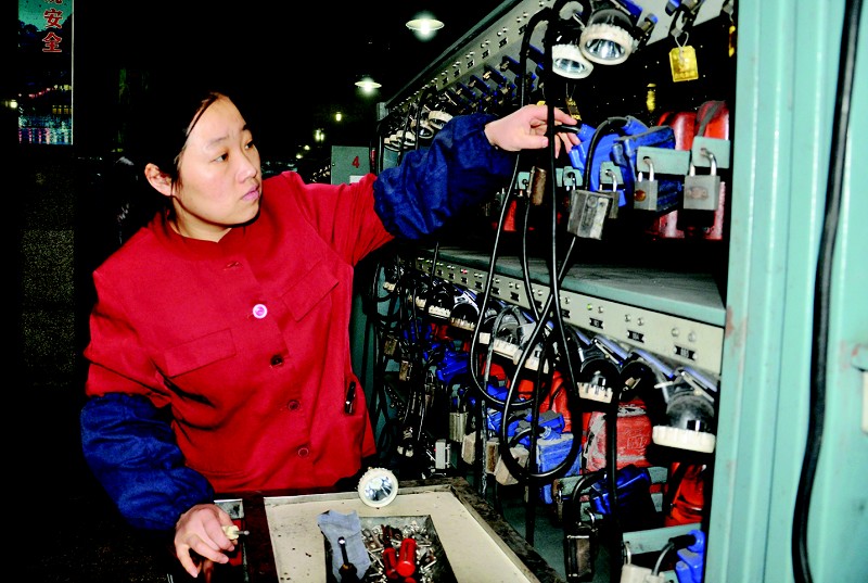 朱仙莊礦燈房班女工樹立“您的滿意我的標(biāo)準(zhǔn)”的服務(wù)理念,為全礦近2000盞礦燈和自救器建立檢修臺賬,對每盞礦燈、每個自救器實行一日一檢,及時消除故障,確保了百米井下礦工的安全使用。圖為該礦燈房班一名女工正在檢查維修礦燈。 (王道玉 攝)