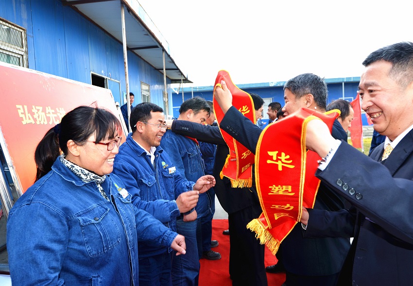 (圖為公司領(lǐng)導(dǎo)為楊芬娣披上“華塑功臣”綬帶)