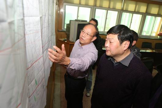 圖為專家查看圖紙