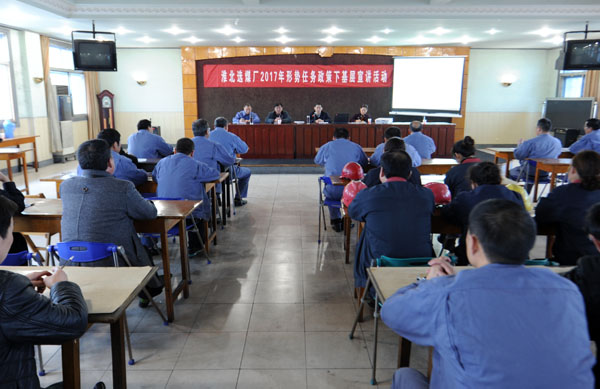 該廠將形勢任務(wù)教育作為統(tǒng)一思想、凝聚人心、助推發(fā)展的“金鑰匙”,按照“務(wù)實(shí)、跟進(jìn)、貼緊”的工作主基調(diào),把企業(yè)發(fā)展政策與職工自身利益結(jié)合起來,把企業(yè)轉(zhuǎn)型發(fā)展與職工個(gè)人理想以及自我價(jià)值的實(shí)現(xiàn)結(jié)合起來,不斷增強(qiáng)形勢教育的目的性、針對性、實(shí)效性。年初,便通過基層聯(lián)系點(diǎn)走訪、專題座談?wù){(diào)研等途徑,掌握基層所思、所盼、所難、所需,做到了職工思想清、基層困難清、生產(chǎn)難點(diǎn)清,從而確定了形勢任務(wù)教育主題,明確學(xué)習(xí)教育重點(diǎn),淮北礦業(yè)和廠兩級工作會(huì)召開后,迅速對宣教工作進(jìn)行部署,建立了廠、車間、班組三級宣傳網(wǎng)絡(luò),以基層為主,以黨員干部、班組長為重點(diǎn),采取上下結(jié)合、點(diǎn)面結(jié)合、集中與分散相結(jié)合的方法,形成了廠領(lǐng)導(dǎo)、車間負(fù)責(zé)人、班段長層層宣講的格局。組成宣講團(tuán)深入生產(chǎn)區(qū),開展了7場宣講會(huì),利用多媒體課件,圖文并茂、提綱挈領(lǐng)地給干部職工宣傳灌輸。從當(dāng)前國際國內(nèi)煤炭市場形勢到淮北礦業(yè)加快轉(zhuǎn)型,從守住安全穩(wěn)定底線到強(qiáng)化生產(chǎn)經(jīng)營管控,從推進(jìn)改革創(chuàng)新到推向質(zhì)量時(shí)代,把當(dāng)前面對的嚴(yán)峻形勢與任務(wù)目標(biāo)一一查擺,有針對性地解答職工群眾熱點(diǎn)、難點(diǎn)、疑點(diǎn)問題,把任務(wù)講明,把思路理清,讓職工既感到壓力,又堅(jiān)定了信心。