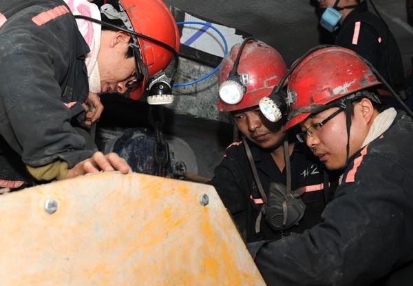 礦綜掘一區(qū)技術員沈思健(右一)正在掘進工作面對職工進行綜掘機技術培訓。