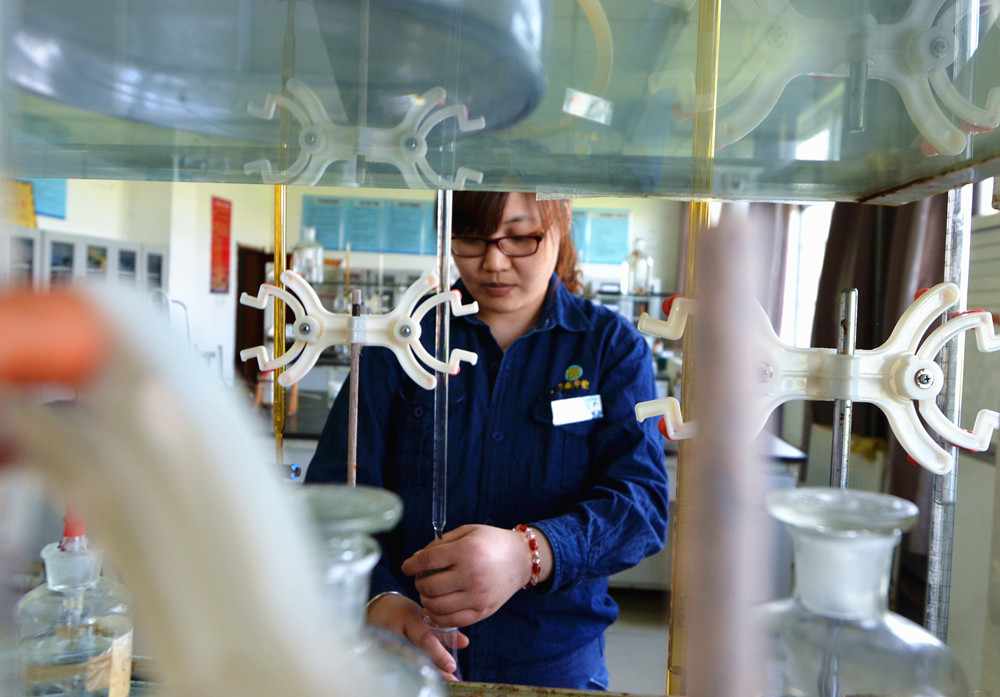 圖為4月20日上午氯堿廠生產技術科一名職工在進行270堿濃度分析。(責編:徐成貴)