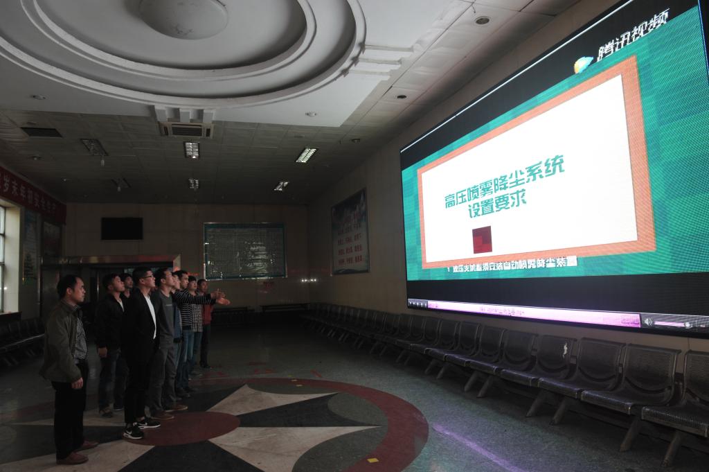 圖為祁南礦職工在井口候罐大廳觀看《煤礦場所職業(yè)病危害》3D動(dòng)漫教育片。