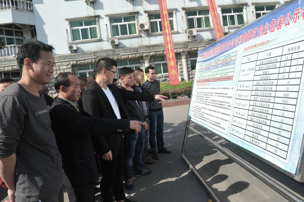 圖為祁南礦職工在工業(yè)廣場觀看職業(yè)危害公示牌板。