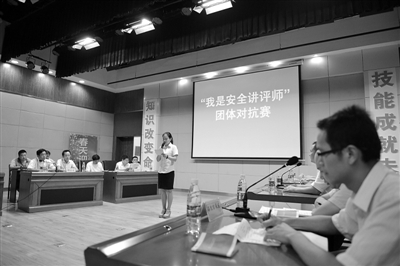 8月7日,淮北礦業(yè)孫疃煤礦舉行“我是安全講評師”團(tuán)體對抗賽。該礦將以前呆板的說教式安全培訓(xùn)變?yōu)槭鹿室曨l分析,精心選擇近年來煤礦發(fā)生的典型事故案例視頻,讓參賽隊(duì)結(jié)合事故經(jīng)過,對事故案例的原因、防范措施進(jìn)行剖析,提高了廣大干部職工排查隱患、分析事故的能力,在礦區(qū)營造了人人爭當(dāng)“安全講評師”的良好氛圍。王亮 攝