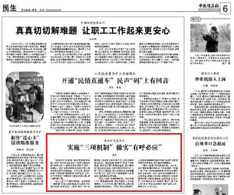 “宿舍的燈光昏暗,能否更換照明設(shè)施?!苯?,淮北礦業(yè)朱莊礦一位職工通過掃描“有呼必應(yīng)”二維碼向該礦反映了這樣一條建議。該礦立即安排相關(guān)單位對職工宿舍的電燈進行全面檢查。今年以來,朱莊礦實施“三項機制”推深做實“民聲呼應(yīng)”工作,在“你呼我應(yīng)”中解決職工群眾的操心事、煩心事和揪心事。