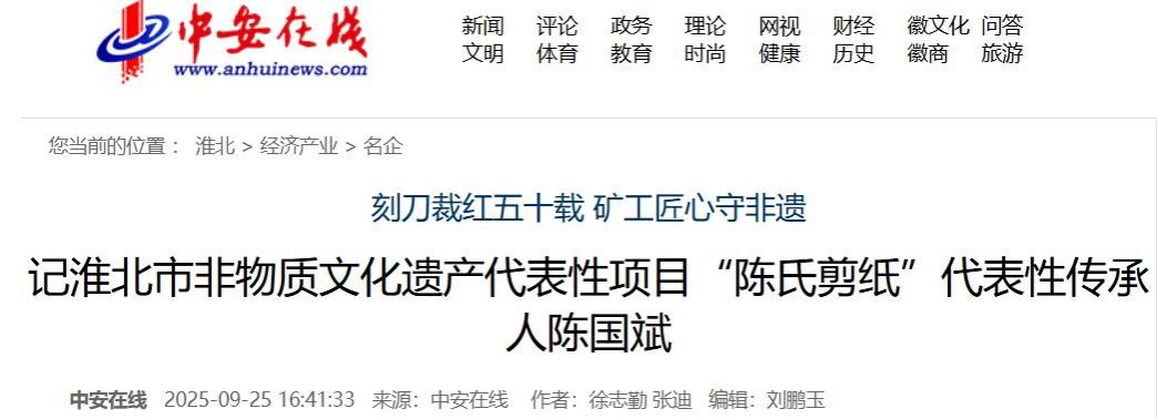 2017年,陳國(guó)斌被命名為淮北市非物質(zhì)文化遺產(chǎn)代表性項(xiàng)目“陳氏剪紙”代表性傳承人。