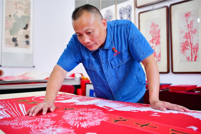 其中,紅色主題是他最擅長(zhǎng)也最喜愛(ài)的。他將黨的豐功偉績(jī)、祖國(guó)巨大變化巧妙融入剪紙中,以藝術(shù)之美傳承紅色文化,賡續(xù)紅色血脈。代表作有《毛主席去安源》《遵義會(huì)議放光芒》、偉人像和毛澤東詩(shī)詞等20多幅。他的作品先后走進(jìn)北京人民大會(huì)堂、中國(guó)美術(shù)館,登上《人民日?qǐng)?bào)》(海外版)等報(bào)刊,還被中國(guó)剪紙藝術(shù)館收藏,更贈(zèng)銷至美、澳、德等國(guó)家和地區(qū),讓世界看見(jiàn)中國(guó)剪紙的魅力。