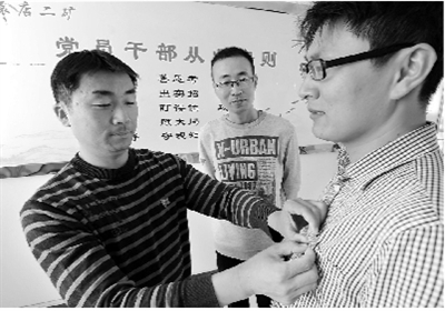 安徽淮北礦業(yè)集團依托“三會一課”等黨的組織生活制度,將“兩學一做”學習教育與安全生產(chǎn)各項工作有機結(jié)合,并開展了“亮身份、作承諾、當先鋒、樹形象”等活動。圖為袁店二礦黨員在相互佩戴黨員徽章。 黃世鵬 攝