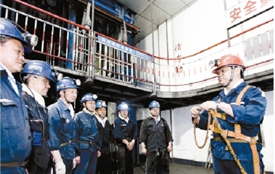 在“兩學一做”教育活動中,安徽淮北礦業(yè)集團楊莊礦黨員義務宣傳安全生產知識。圖為該礦共產黨員、保運一區(qū)隊長楊杰(右一)向工友傳授保險繩使用技巧。鄭洪光 攝
