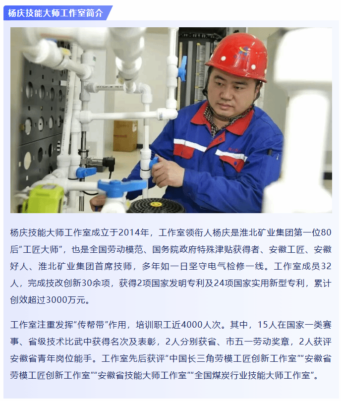 楊慶技能大師工作室成立于2014年,工作室領(lǐng)銜人楊慶是淮北礦業(yè)集團(tuán)第一位80后“工匠大師”,也是全國勞動(dòng)模范、國務(wù)院政府特殊津貼獲得者、安徽工匠、安徽好人、淮北礦業(yè)集團(tuán)首席技師,多年如一日堅(jiān)守電氣檢修一線。工作室成員32人,完成技改創(chuàng)新30余項(xiàng),獲得2項(xiàng)國家發(fā)明專利及24項(xiàng)國家實(shí)用新型專利,累計(jì)創(chuàng)效超過3000萬元。