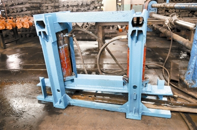 童亭礦技術(shù)人員自制了鋼帶取直器。技術(shù)人員把一塊厚鋼板作為底座,在鋼板兩側(cè)按照鋼帶的彎曲度挖兩個凸槽,并在中線位置挖一個凹槽作為鋼帶的塑形支撐點,利用油缸的伸縮,即可取直鋼帶,達到塑形目的。