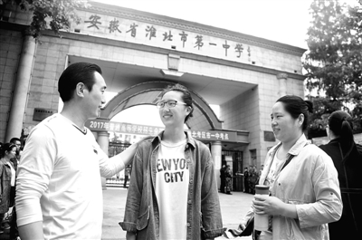 安徽淮北礦業(yè)集團(tuán)楊柳礦提前1個(gè)月摸底,讓58名職工回家陪子女參加高考,并如數(shù)支付其2天的工資。圖為6月7日,高考第一天,該礦掘進(jìn)一區(qū)職工孫金林(左)與妻子送女兒到考點(diǎn)。