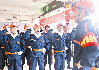 淮北礦業(yè)集團楊柳煤業(yè)公司輪值班組長帶領(lǐng)職工進行安全宣誓。祝大明 攝《中國煤炭報》(6月19日1版)