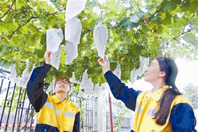 “車間小果園,綠色無公害,吃著真不賴!”安徽淮北礦業(yè)集團(tuán)鐵運(yùn)處臨渙機(jī)輛段檢車員們利用休班時(shí)間在單位空地上種植了果樹,目前小果園里的桃、杏已經(jīng)成熟,可供食用。圖為兩名女職工在給葡萄套袋。