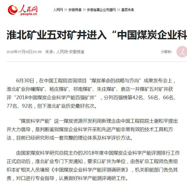 6月30日,在中國工程院咨詢項目“煤炭革命的戰(zhàn)略與方向”成果發(fā)布會上,淮北礦業(yè)孫疃煤礦、楊莊煤礦、祁南煤礦、朱莊煤礦、袁店一井煤礦五對礦井獲評“2018中國煤炭企業(yè)科學(xué)產(chǎn)能百強礦井”,分列百強榜第42名、56名、66名、77名、92名,創(chuàng)下淮北礦業(yè)歷史最好名次。